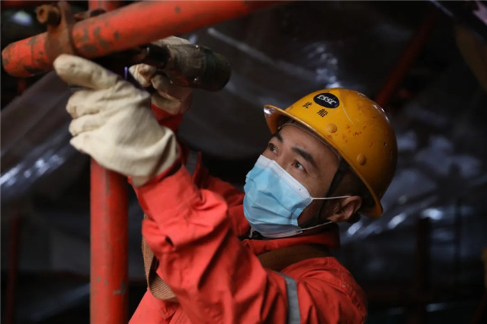 ▲21:30,某产品机舱里,年轻管工师傅艰难地爬进狭缝里,准备焊接管件